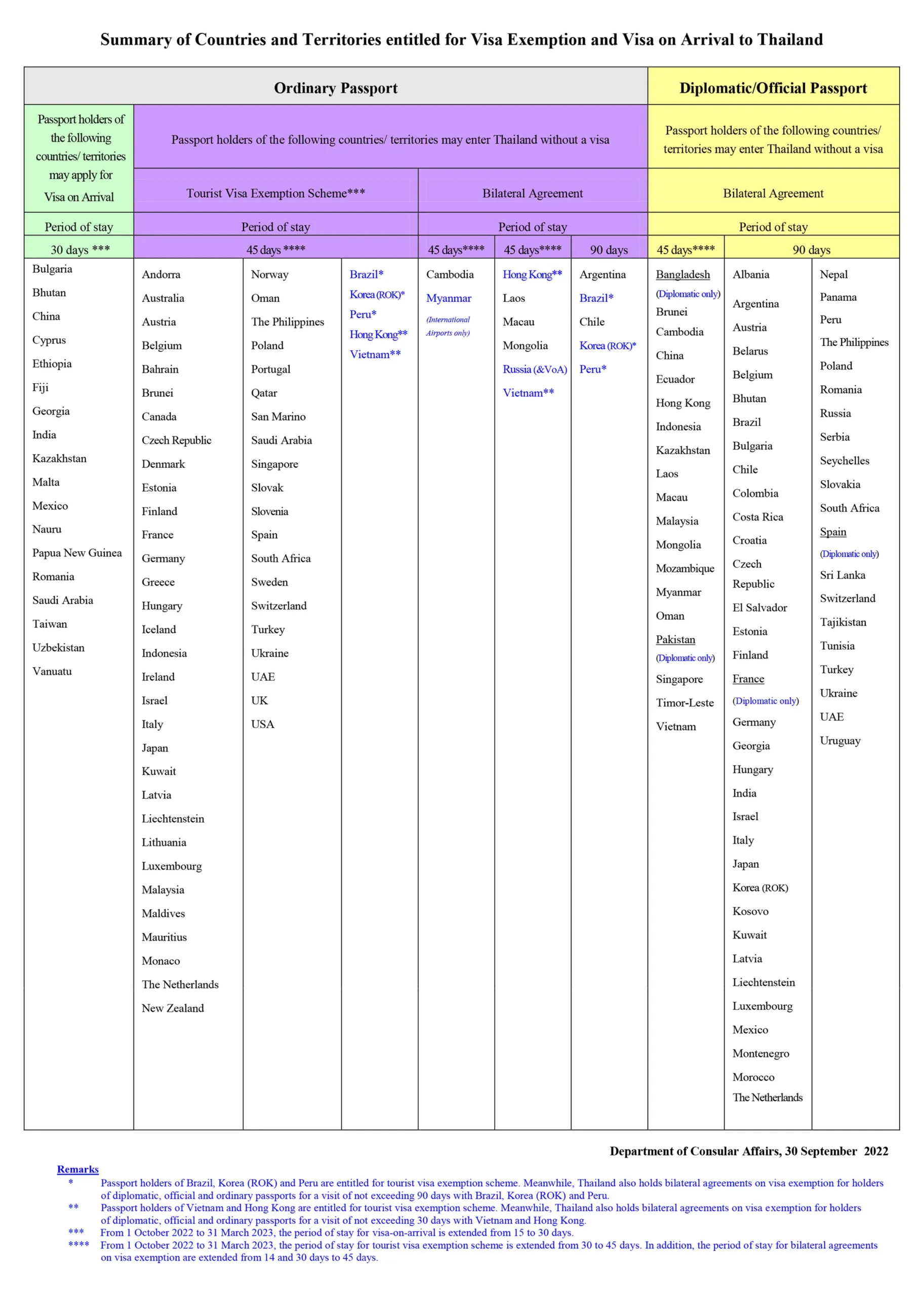 (See below image: “Summary of Countries and Territories entitled for Visa Exemption and Visa on Arrival to Thailand”)