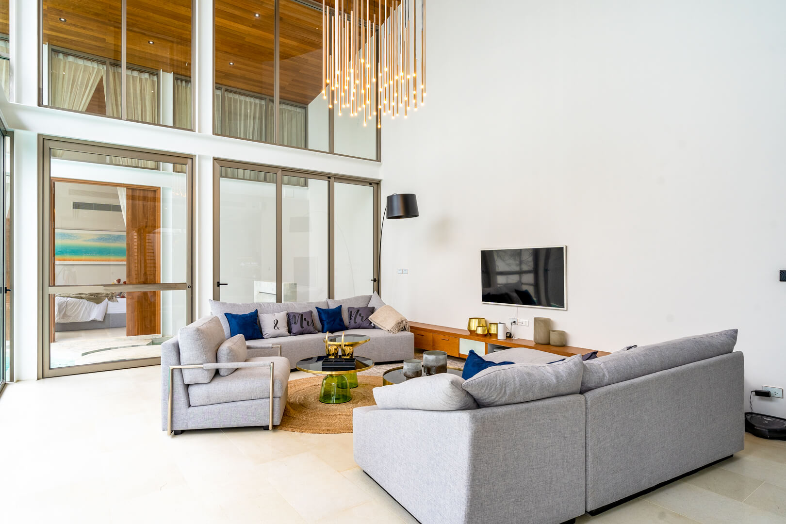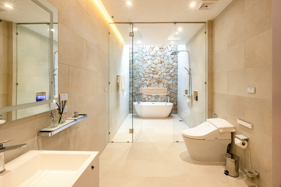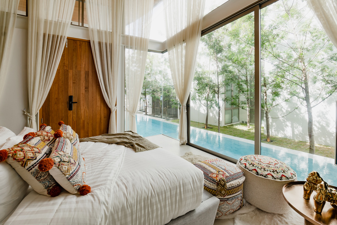 Distinctive contemporary pool villas blend modern, minimalist architecture with gracefully curved roofs and floor-to-ceiling windows for a light and airy look reminiscent of age-old Asian designs. Available in two floor plan models.